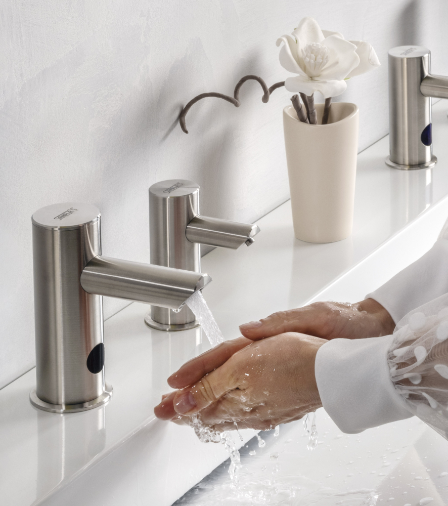 Les robinets et les distributeurs fonctionnent grâce à un capteur qui élimine tout contact avec la surface. L’utilisation est ainsi parfaitement hygiénique et confortable. Le rinçage hygiénique automatique des robinets contribue en outre à prévenir la prolifération de bactéries telles que la légionelle.