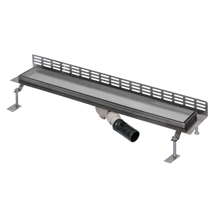 SLKN 16 - N° de fourniture 69160 - évacuation, bac en acier inoxydable (pour insertion de carrelage, hauteur max. du carrelage 12 mm - évacuation pour carrelage plus épais possible sur commande), siphon, pieds de montage avec vis M10 (4 pcs.), outil pour retirer la grille, bande d'étanchéité, kit de montage