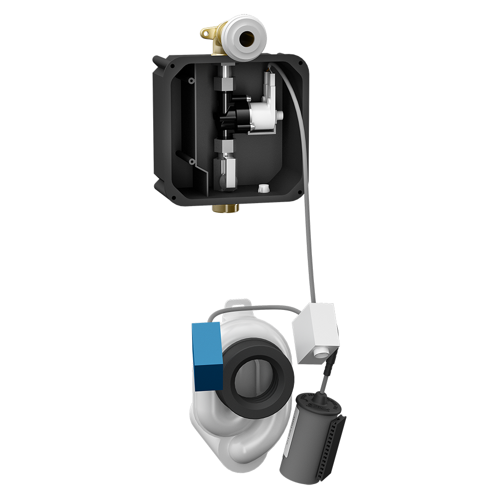 - l'ensemble de l'unité de chasse est placé derrière l'urinoir