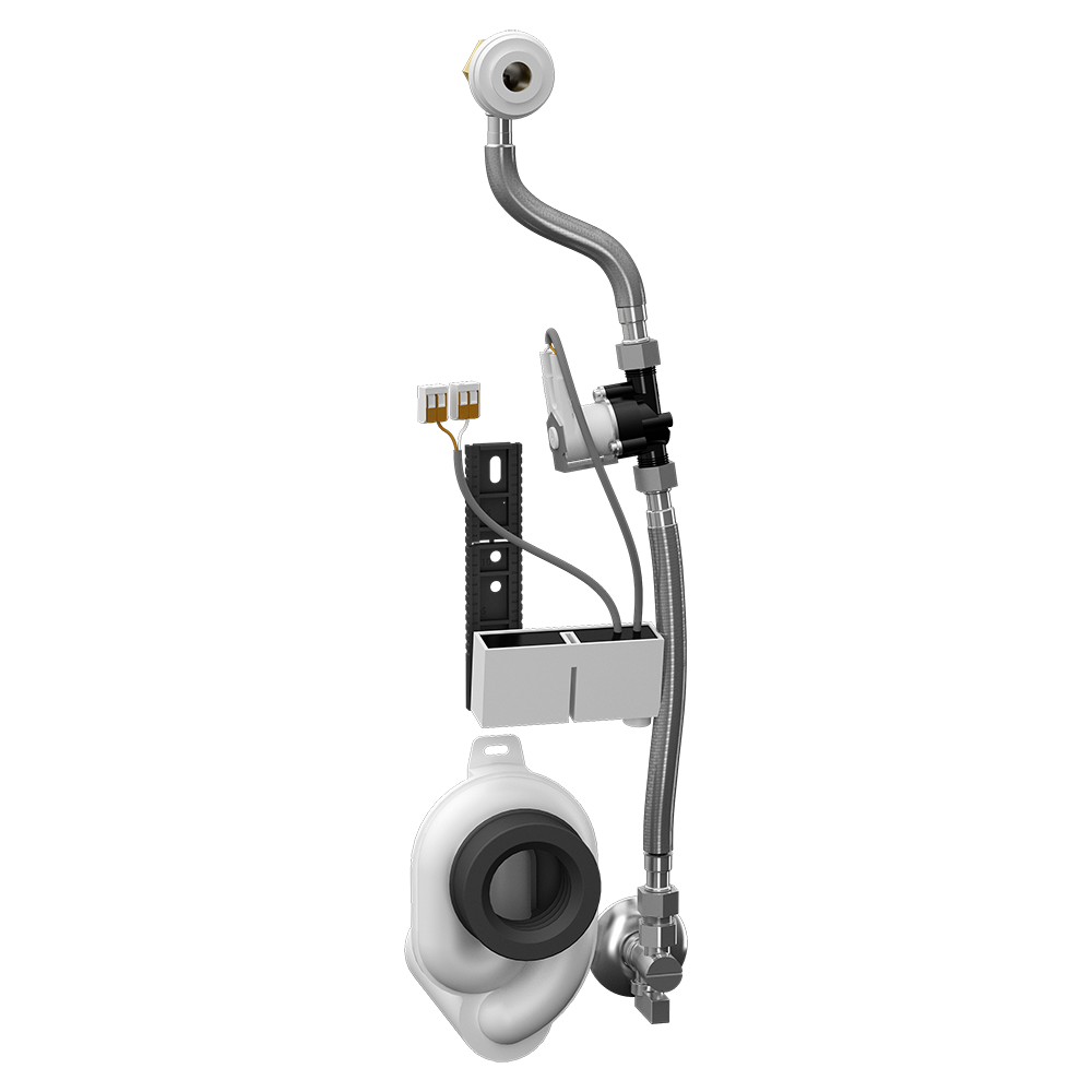 SLP 68RS - Réf. 11685 - unité de chasse radar comprenant un module Bluetooth sur le rail de montage, une vanne électromagnétique, un bouchon en silicone (2 pcs.), des tuyaux de raccordement, un robinet d’angle avec filtre et clapet anti-retour, un raccord d’entrée avec joint en caoutchouc, un siphon, un gabarit de perçage papier