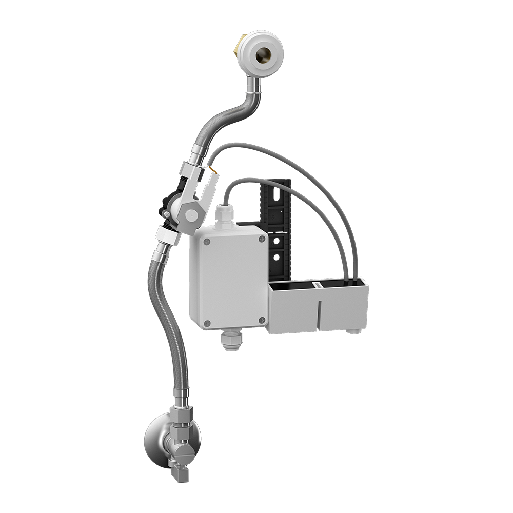 SLP 69RZ - Réf. 01695 - unité de chasse radar comprenant un module Bluetooth sur le rail de montage, une vanne électromagnétique, des tuyaux de raccordement, un robinet d’angle avec filtre et clapet anti-retour, un raccord d’entrée avec joint en caoutchouc, un gabarit de perçage papier, une alimentation électrique