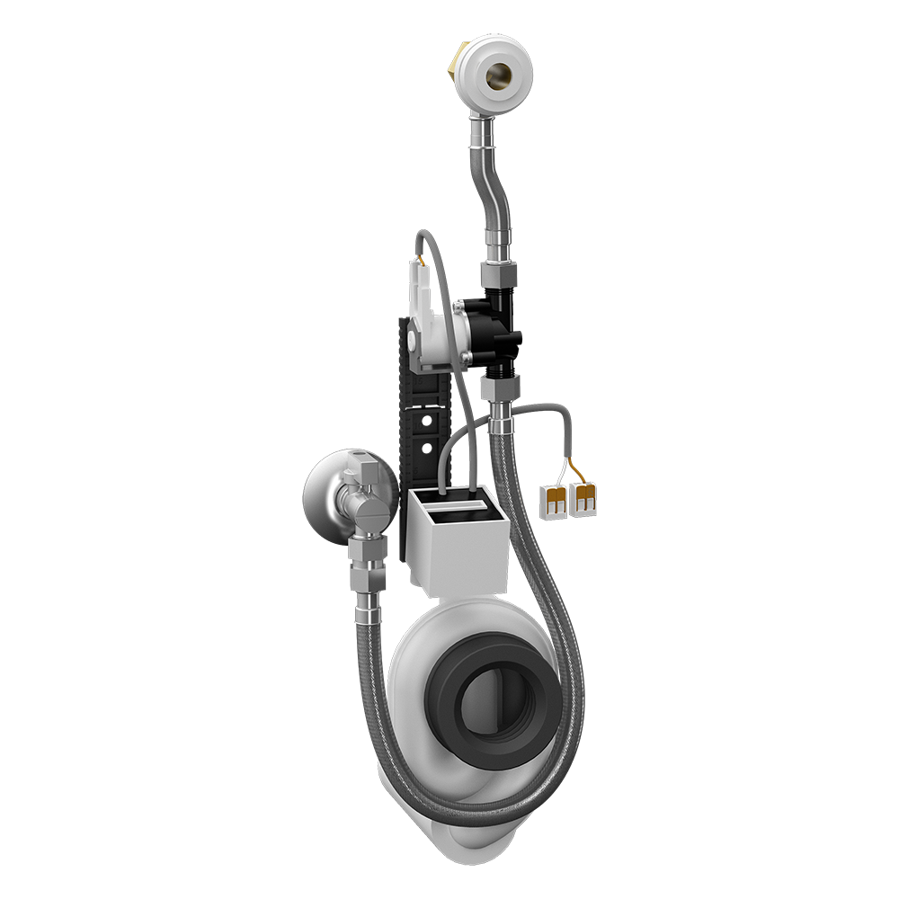 SLP 70RS - Réf. 11705 - unité de chasse radar comprenant un module Bluetooth sur le rail de montage, une vanne électromagnétique, un bouchon en silicone (2 pcs.), des tuyaux de raccordement, un robinet d’angle avec filtre et clapet anti-retour, un raccord d’entrée avec joint en caoutchouc, un siphon, un gabarit de perçage papier