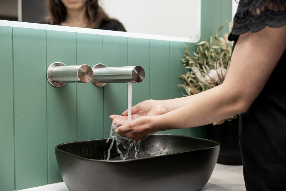 - l'eau s'arrête de couler après le retrait des mains de la zone active du capteur, après un délai réglable (réglable entre 0,25 et 7,75 s)