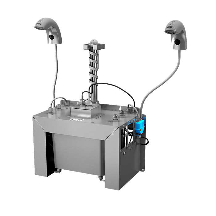 SLU 45M2 - Réf. 03453 - robinet avec électronique (2 pcs.), tuyaux de raccordement, électrovanne (2 pcs.), distributeur central de savon avec pompes péristaltiques pour savon liquide et réservoir de savon de 6 l, alimentation SLZ 01Y, télécommande SLD 03