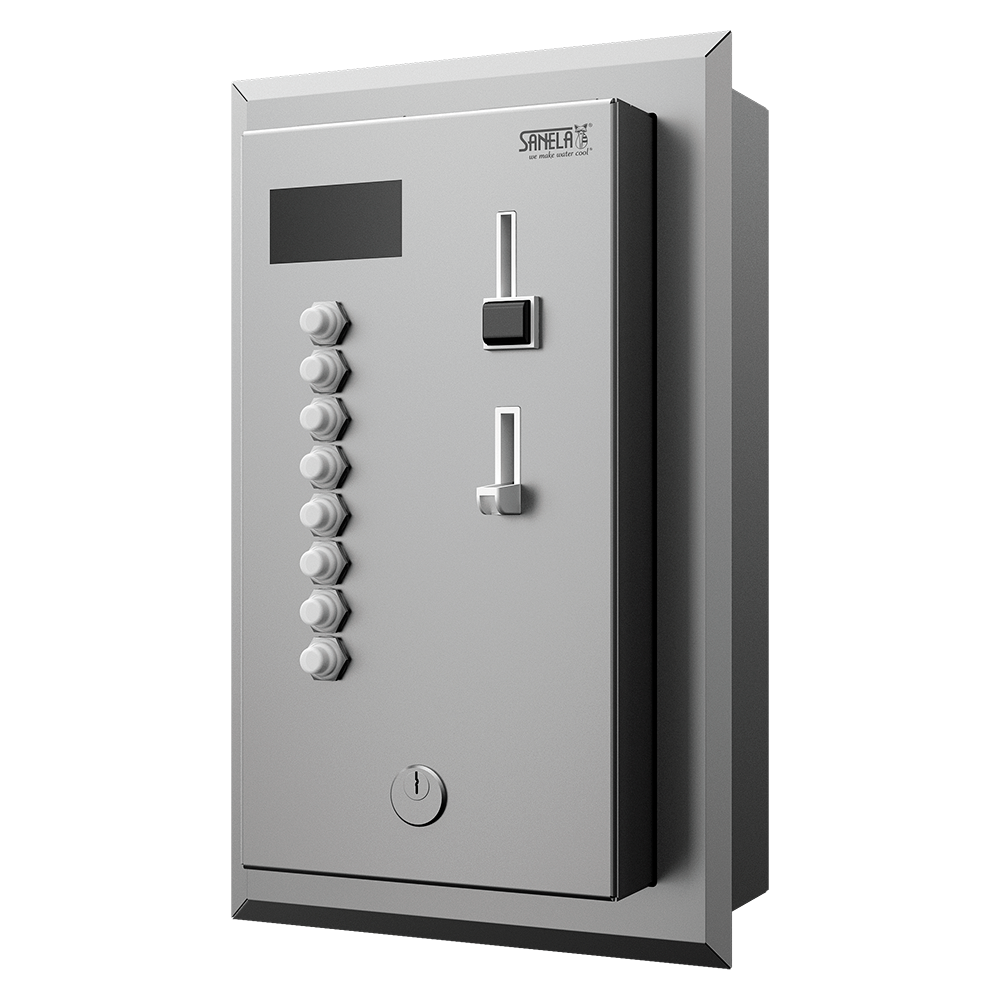 Minuterie de douche à pièces et jetons encastrée pour quatre à huit douches, 24 V CC, choix de la douche par l'utilisateur, commande directe