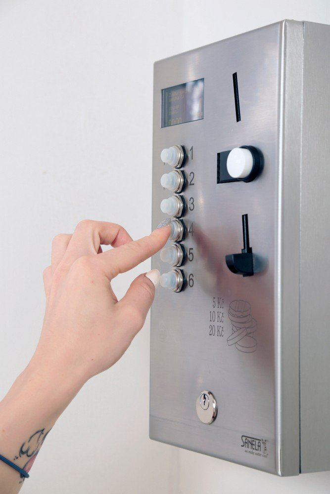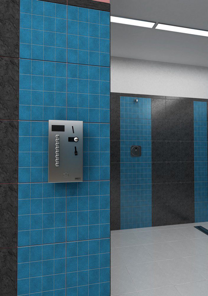 - after inserting a coin or a token the machine starts water flow on several seconds to indicate the chosen shower