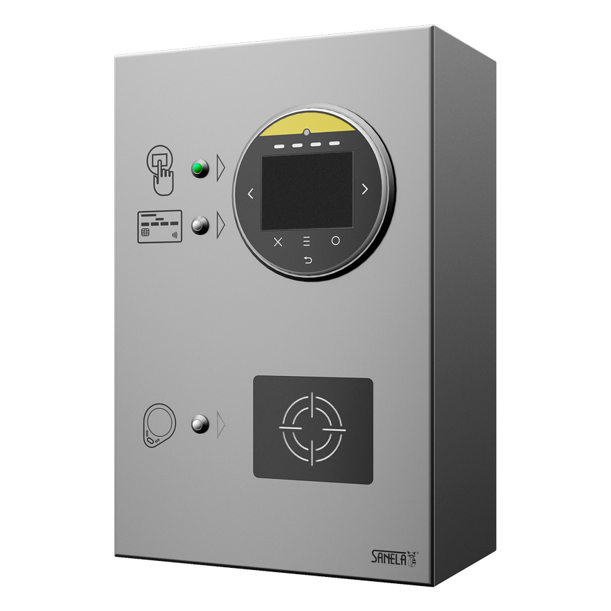 SLZA 30D - Réf. 89307 - appareil de paiement en acier inoxydable avec électronique comprenant module Bluetooth, lecteur de carte bancaire, lecteur pour recharger les jetons RFID, recharge logicielle