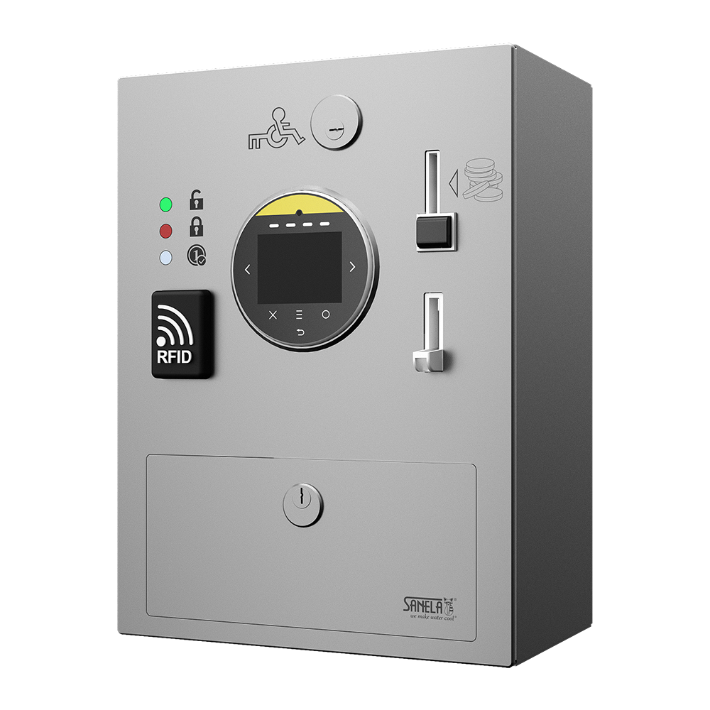 SLZA 43AV - Réf. 88439 - appareil de paiement en acier inoxydable avec électronique comprenant module Bluetooth, boîte à monnaie, porte-monnaie, lecteur de carte de crédit, lecteur de valeur de crédit de jeton RFID, jeu de clés (2 pcs.), ouvre-porte SW, serrure euro avec eurokey