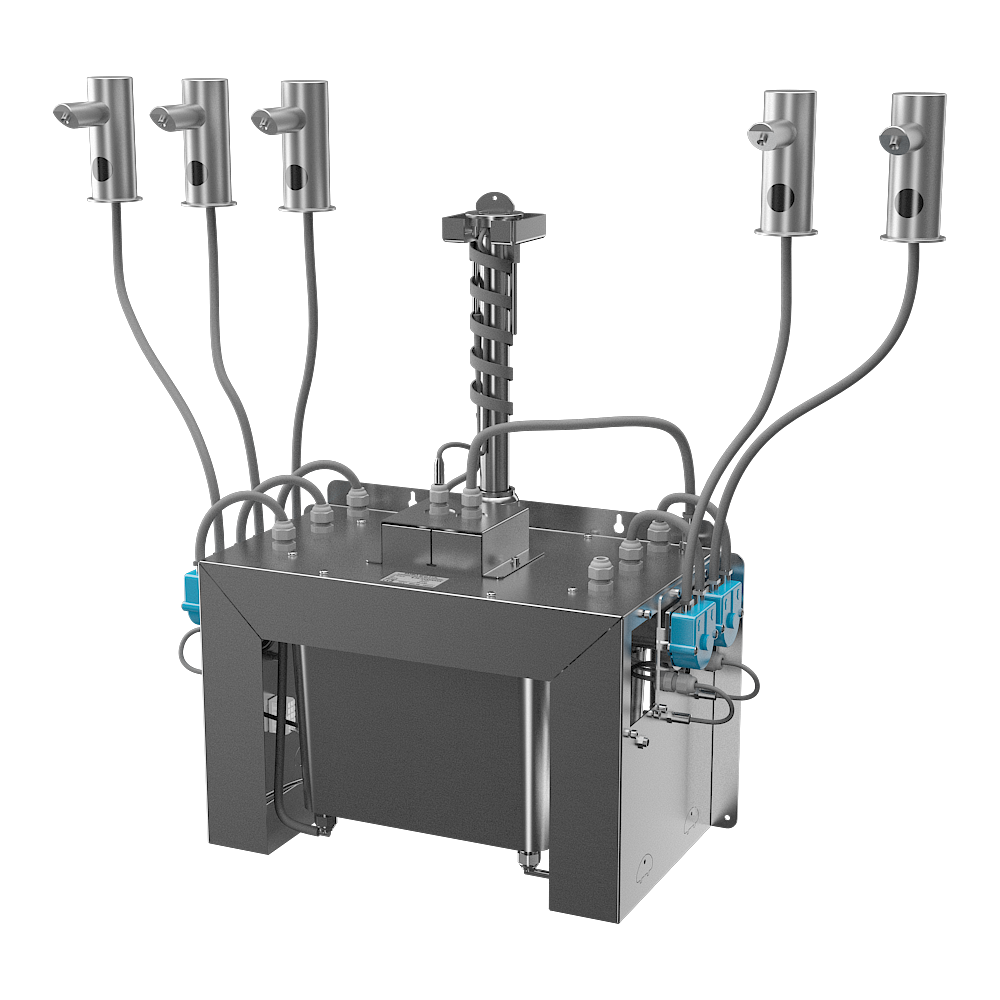 SLZN 91E5 - Réf. 85915 - bec en acier inoxydable avec électronique (5 pcs.), tuyaux d’arrivée, distributeur central de savon avec pompes péristaltiques pour savon liquide et réservoir de savon de 6 l, alimentation SLZ 01Y, télécommande SLD 03