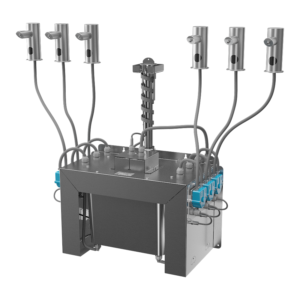 SLZN 91E6 - Réf. 85916 - bec en acier inoxydable avec électronique (6 pcs.), tuyaux d’arrivée, distributeur central de savon avec pompes péristaltiques pour savon liquide et réservoir de savon de 6 l, alimentation SLZ 01Y, télécommande SLD 03
