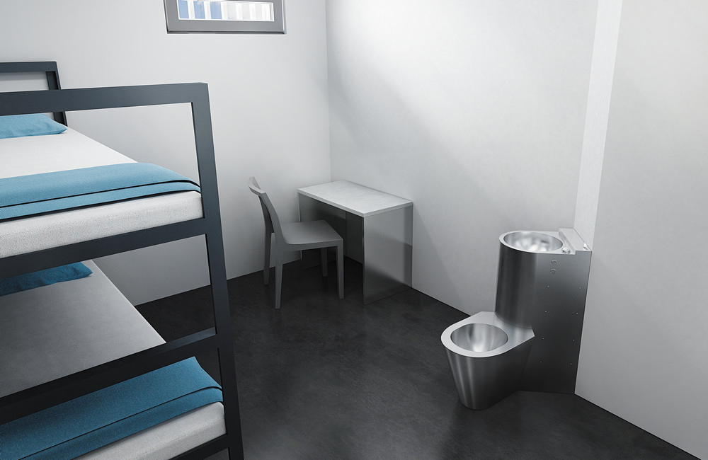 Les chasse‑d’eau des urinoirs et WC, ainsi que les commandes de douche, sont dotés de couvercles anti‑vandalisme en acier inoxydable de 3 mm d’épaisseur et de vis de sécurité. Les robinets sont équipés de « bras anti‑suicide » en acier inoxydable spécial, qui minimisent le risque d’automutilation.